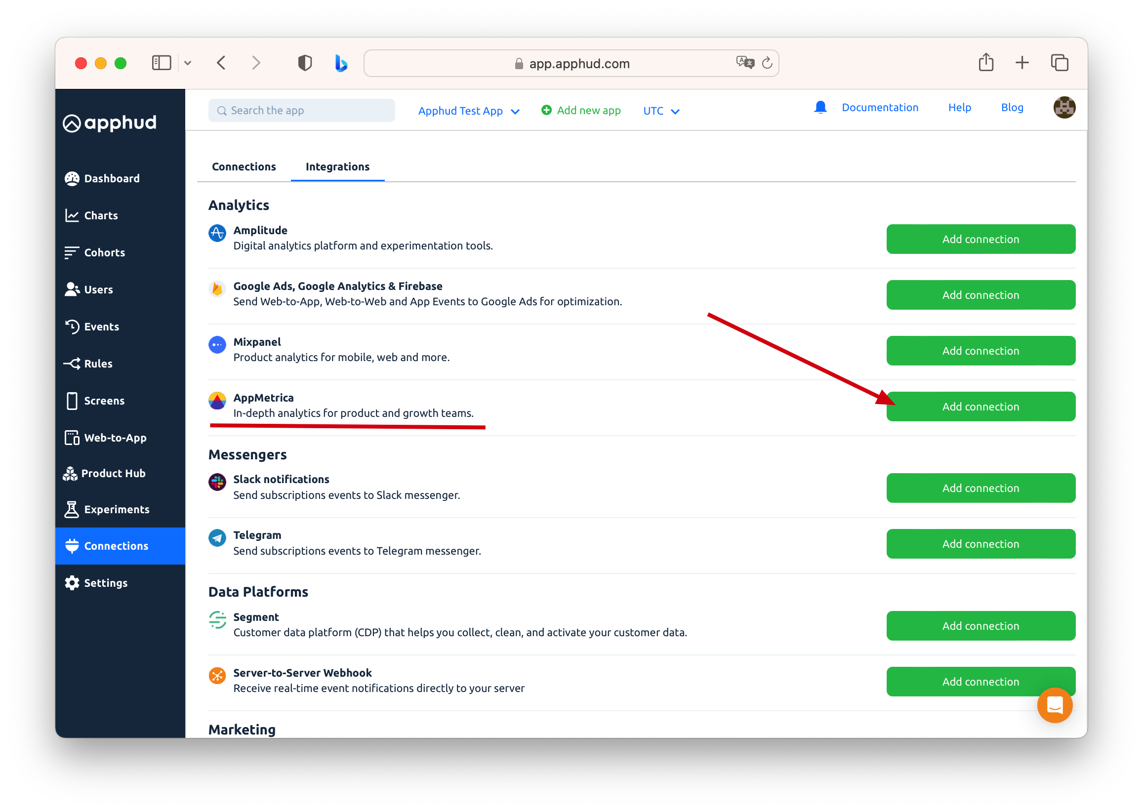 At Apphud go to Connections > Integrations, find AppMetrica and click on "Add connection". In the opened pop-up choose a Source: iOS, Android, or Flows.