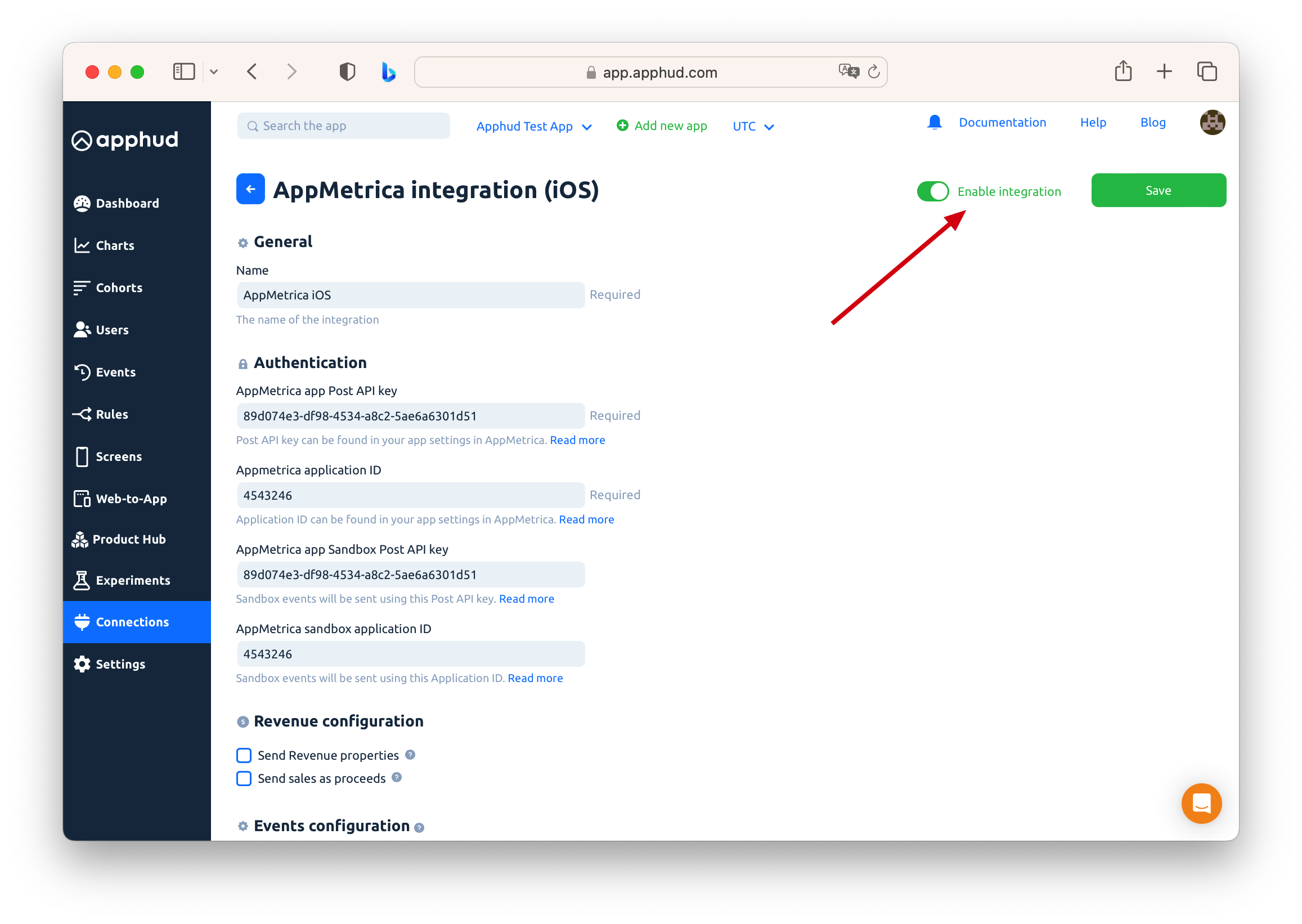 Send revenue properties - if checked, Apphud will report revenue to this integration.