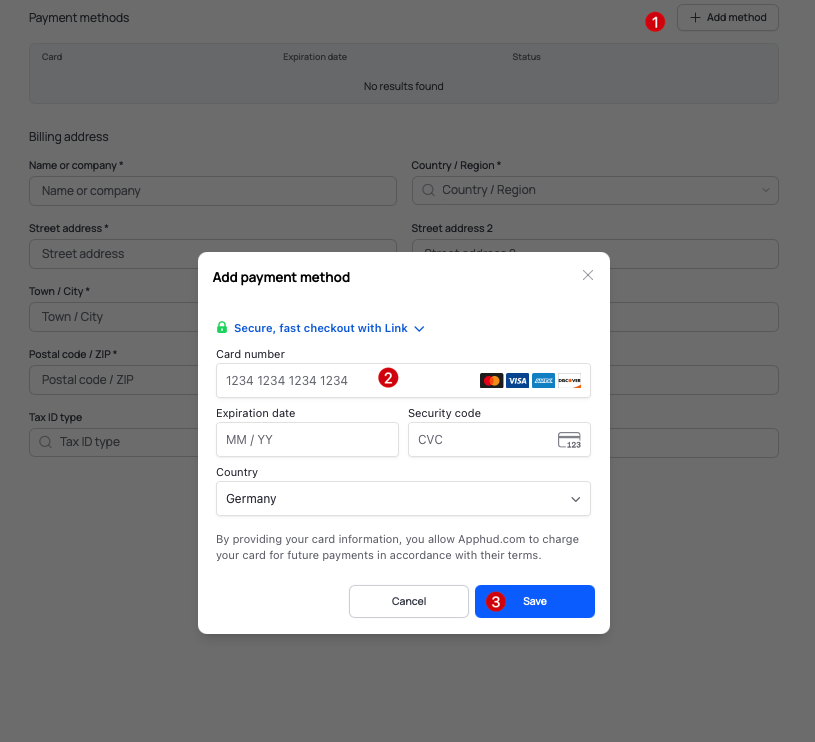 You can add a new payment method by clicking + Add method button and entering the card details, e.g., when your card is about to expire, to ensure uninterrupted access to Apphud services.